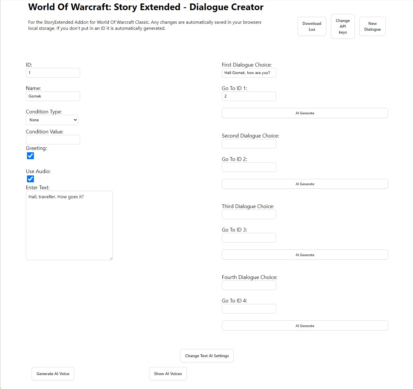It's meant to bring deeper story telling and more immersion into the game, as well as modernize the narrative experience. Ultimately this is supposed to be a community project. That means that dialogue texts will be mostly written by the World Of Warcraft Community, giving everyone a chance to flesh out their favourite character. This is why I also developed an easy to use web app for players to write their own dialogues and export them to World Of Warcraft. To help with the process I also added integrations for OpenAI text generation and ElevenAI voice generation.